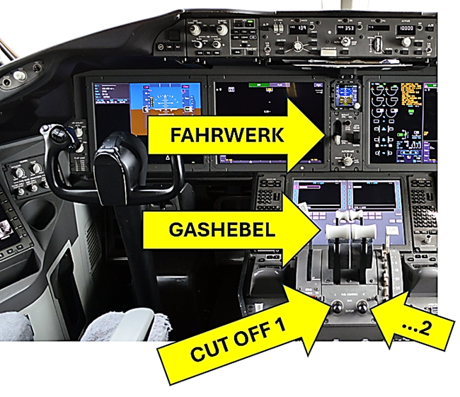 Es ist Routine, dass ein Kapitän seine rechte Hand auf den beiden Gashebeln hat, während das Flugzeug auf der Bahn Anlauf nimmt. So könnte er, falls es notwendig sein sollte den Start abzubrechen, sofort das Gas wegnehmen, um und die Maschine noch vor dem Ende der Bahn zum Stehen zu bringen. Im Normalfall hebt eine Maschine natürlich ab, worauf der Kapitän die Gashebel loslässt. Könnte dem Kapitän beim besagten Flug dabei die Hand versehentlich auf die Cutoff-Schalter unterhalb der Gashebel gerutscht sein? Natürlich waren sich die Konstrukteure bei Boeing dieses Risikos bewusst, und um jegliches ungewollte Absperren des Treibstoffs zu verhindern, müssen die Hebelchen der Schalter erst mit Daumen und Zeigefinger hochgezogen werden, bevor man sie umlegen kann.