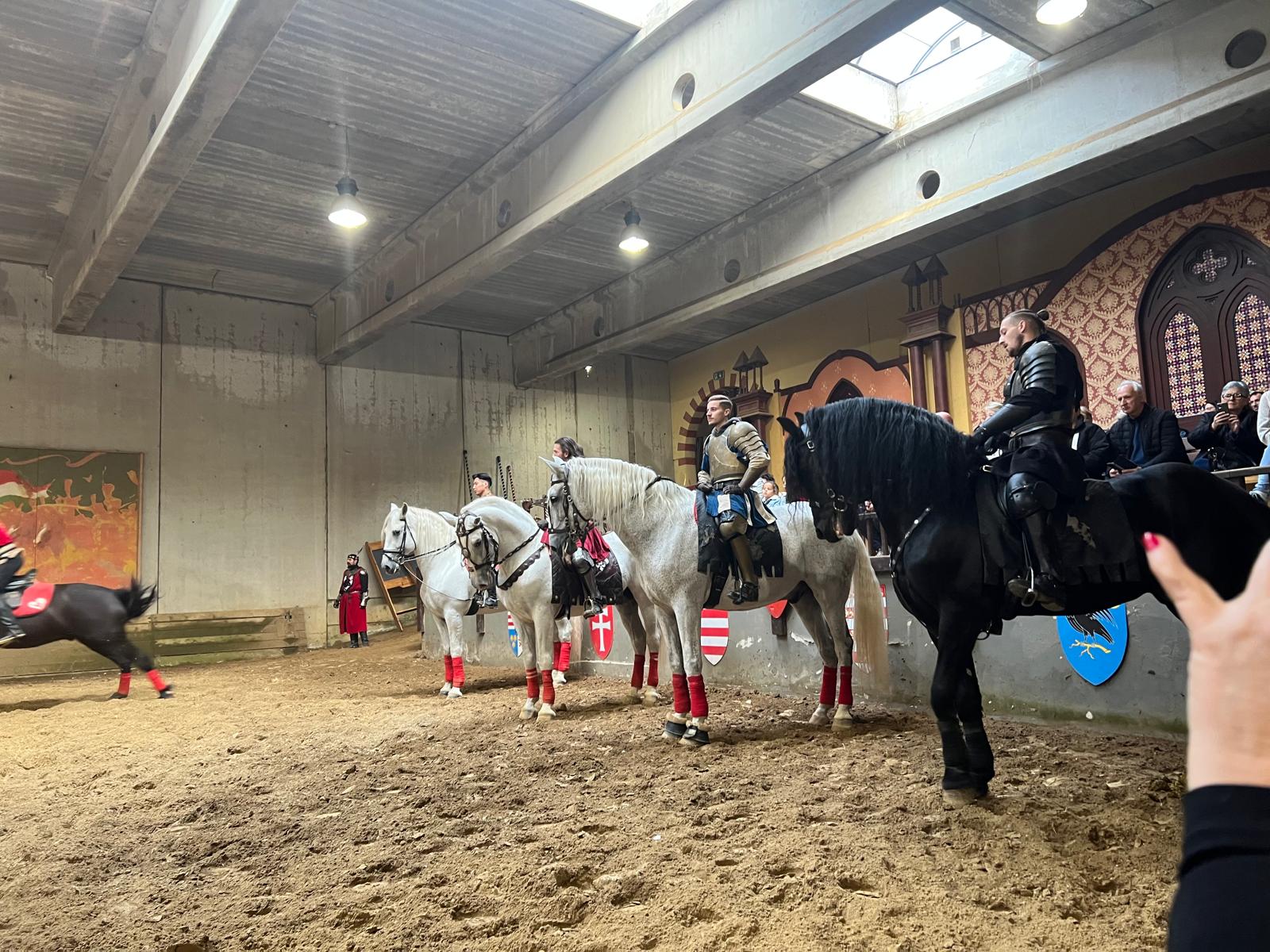 Imre Papp, so heißt der Burgkapitän, hatte 1988 die Trümmer von der Gemeinde Sümeg gekauft, weil die nichts damit anfangen konnte. Papp war kein reicher Mann. Er betrieb auf dem Berg ein kleines Café. Er begann mit seiner Familie, die Trümmer freizulegen und dann die Burg wieder aufzubauen. Nach und nach halfen Freunde, Bekannte und interessierte Freiwillige. Es waren nach dem Sturz des kommunistischen Regimes die wilden 90er-Jahre, in denen es noch nicht die bürokratischen Strukturen gab, die sich auch im heutigen Ungarn herausgebildet haben und die ein solches Unternehmen heute kaum mehr möglich machen würden. Als die Burg im alten Umfang wieder stand, war Papp klar, dass er einen Touristenmagneten brauchte. Er gründete die Reitschule, in der es regelmäßige Vorführungen ungarischer und mongolischer Reitkünste gibt. Nach der Vorstellung werden die hunderten Zuschauer in rekonstruierten Gewölben mittelalterlich verköstigt. Die Darsteller, die nach der Vorstellung auch die Kellner sind, tragen wunderschöne historische Kostüme. Man trinkt Wein, Bier oder Wasser, isst Gänsekeule, Blutwurst und Weißkraut mit den bloßen Händen und sieht darüber weg, dass es im Mittelalter noch keine Kartoffeln gab.