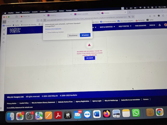 Als ich die Mitteilung bekam, dass ich einchecken könnte, versuchte ich das zu tun, bekam aber immer nur Fehlermeldungen. Auch bei meinem Sohn, den ich um Hilfe bat, kam eine Fehlermeldung. Dann bekam ich von Wizz Air eine E-Mail, mit der mir mitgeteilt wurde, ich solle am Flughafen einchecken. Ich versuchte am Morgen des 3.10. noch einmal einzuchecken – wieder Fehlermeldung.